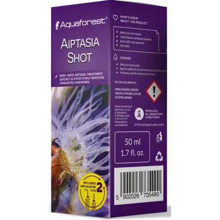 Aquaforest Aiptasia Shot è una soluzione pronta all’uso, formulata per il controllo rapido ed efficace della popolazione di anemoni Aiptasia e Manjano negli acquari marini. Questi anemoni sono noti per la loro rapida proliferazione, rendendo difficile una loro rimozione meccanica. Inoltre, rappresentano una minaccia per i coralli e gli organismi marini sensibili, motivo per cui è fondamentale intervenire tempestivamente per prevenire la loro espansione incontrollata.