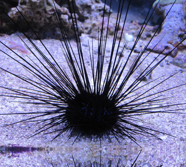 Diadema savignyi è un invertebrato marino molto apprezzato per il suo aspetto elegante e particolare: il corpo scuro è circondato da lunghissime spine sottili, spesso con riflessi blu-verdi, che lo rendono un vero elemento scenografico in acquario.