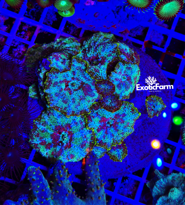 Sotto illuminazione LED attinica la loro fluorescenza può diventare sorprendente: i rossi si accendono di toni incandescenti, i verdi acquisiscono una brillantezza elettrica, mentre i blu e i viola mostrano una profondità luminosa quasi liquida. L’intero disco sembra “respirare luce”, creando un effetto morbido e ipnotico che risalta perfettamente sulla rocciata.