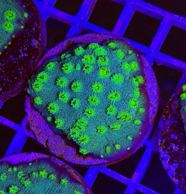 La Echinopora Hollywood Stunner è un corallo LPS molto apprezzato per la sua crescita a piatto e a mensola, che crea forme ondulate e stratificate estremamente scenografiche. La sua colorazione viola intenso con margini verde fluo acceso la rende uno dei coralli più iconici e ricercati nel mondo reef, capace di risaltare in modo spettacolare sotto illuminazione LED.