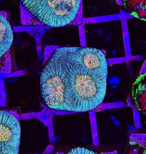 La Favia è un corallo LPS molto apprezzato per la sua struttura massiccia e i polipi ben separati, che creano un elegante effetto “a celle” con un marcato rilievo tridimensionale. Le sue colorazioni possono variare dal verde intenso al rosso, dall’arancio al viola, spesso accompagnate da bocche centrali fluorescenti che ne esaltano il fascino sotto illuminazione LED.