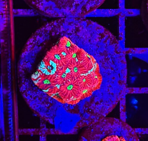 Il Favites è un corallo LPS molto apprezzato per la sua struttura compatta e i polipi disposti in modo ordinato, che formano disegni geometrici affascinanti e dall’aspetto tridimensionale. Le sue colorazioni, che spaziano dal verde brillante al rosso intenso, spesso con contrasti fluorescenti tra bocca e margine, la rendono un corallo di grande impatto visivo sotto illuminazione LED.