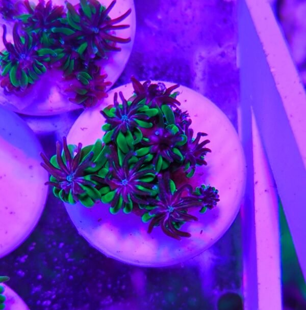 La Galaxea fascicularis è un corallo LPS di grande fascino, riconoscibile per i suoi polipi affusolati e sottili che, quando completamente estesi, creano un effetto scenografico e brillante. Le sue tonalità possono variare dal verde fluorescente al marrone dorato, spesso con punte luminose che risaltano magnificamente sotto illuminazione LED blu, donando alla vasca un aspetto vivace e ricco di movimento.