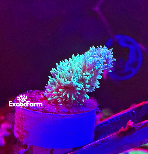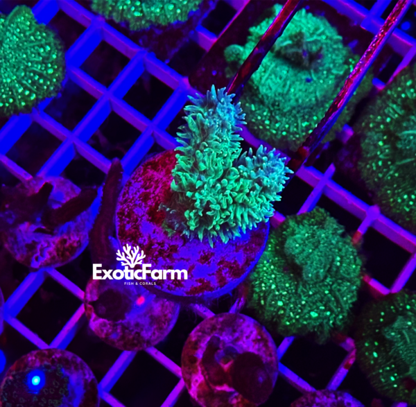 La colonia cresce formando strutture robuste e leggermente ramificate, con tessuto ben aderente allo scheletro e polipi molto piccoli ma ben distribuiti. Il verde brillante tende a mantenersi stabile nel tempo in presenza di una buona illuminazione e di parametri equilibrati.