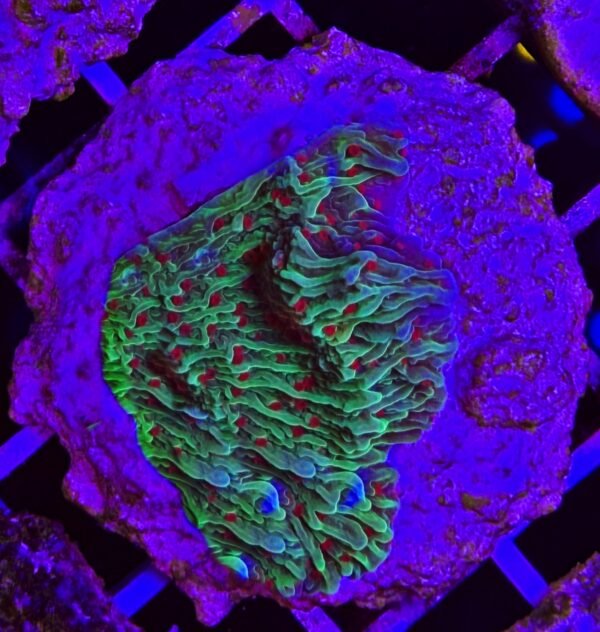 Sotto illuminazione LED attinica, i colori diventano ancora più accesi e vibranti, creando un effetto caldo e “piccante” unico nel suo genere. La texture puntinata e la crescita compatta la rendono perfetta per creare tappeti colorati o accenti decisi sulla rocciata.