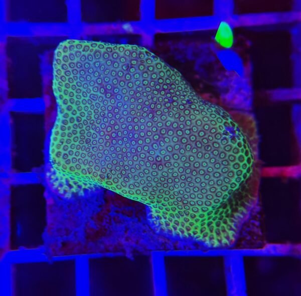 La crescita è massiva e incrostante, con una struttura solida e ben definita che dona alla colonia un aspetto naturale e maturo. La superficie appare punteggiata in modo regolare dai polipi verde acceso, che creano un contrasto netto e ordinato con la base più scura, rendendo il disegno del corallo estremamente leggibile e armonioso.
