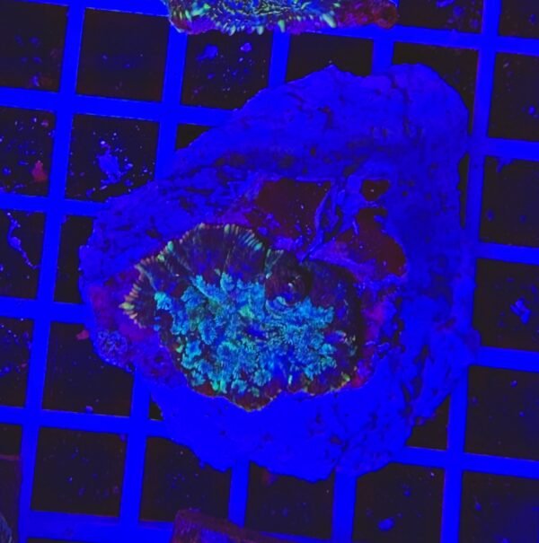Sotto illuminazione LED attinica, la loro fluorescenza diventa davvero spettacolare: i toni verdi si accendono di una luminosità elettrica, mentre i punti e le sfumature centrali emergono con una definizione straordinaria, creando un effetto quasi tridimensionale. Un piccolo “paesaggio alieno” che prende vita sul reef.