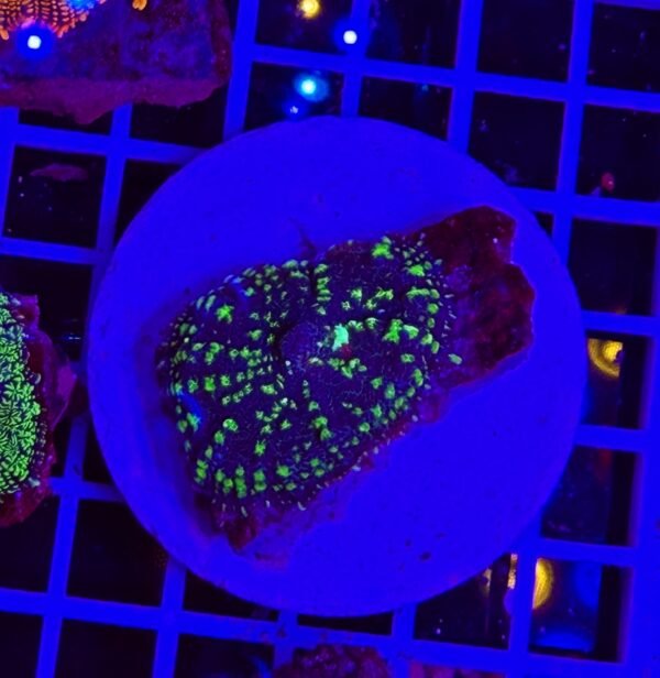 Sotto illuminazione LED attinica, la loro fluorescenza diventa davvero spettacolare: i toni verdi si accendono di una luminosità elettrica, mentre i punti e le sfumature centrali emergono con una definizione straordinaria, creando un effetto quasi tridimensionale. Un piccolo “paesaggio alieno” che prende vita sul reef.