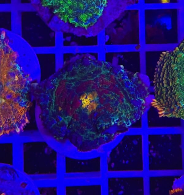 Sotto illuminazione LED attinica, la loro fluorescenza diventa davvero spettacolare: i toni verdi si accendono di una luminosità elettrica, mentre i punti e le sfumature centrali emergono con una definizione straordinaria, creando un effetto quasi tridimensionale. Un piccolo “paesaggio alieno” che prende vita sul reef.
