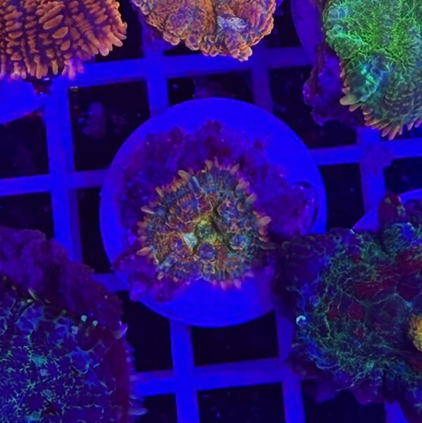 Sotto illuminazione LED attinica, la loro fluorescenza diventa davvero spettacolare: i toni verdi si accendono di una luminosità elettrica, mentre i punti e le sfumature centrali emergono con una definizione straordinaria, creando un effetto quasi tridimensionale. Un piccolo “paesaggio alieno” che prende vita sul reef.