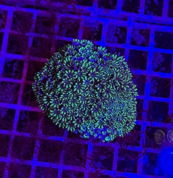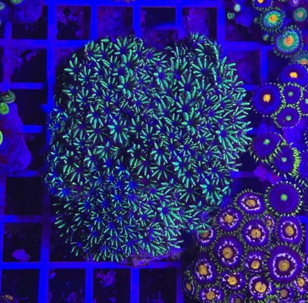 Uno dei suoi punti di forza è la crescita compatta e omogenea: si espande in piccoli ciuffi molto ordinati che, nel tempo, formano un manto denso e uniforme, perfetto per valorizzare zone spoglie del reef o per creare contrasti cromatici con LPS e SPS più massicci. La sua natura delicata ma vigorosa lo rende un ottimo candidato per composizioni ricercate e per acquari che puntano su armonia e colore.