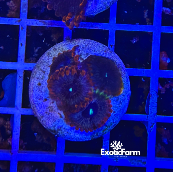 Lo Zoanthus “Bottom Left White” colpisce per la sua eleganza cromatica e per il contrasto raffinato tra toni freddi e caldi. Ogni polipo è caratterizzato da un sottile bordino rosso che ne definisce con precisione il profilo, avvolgendo un corpo viola intenso e vellutato, profondo e uniforme.